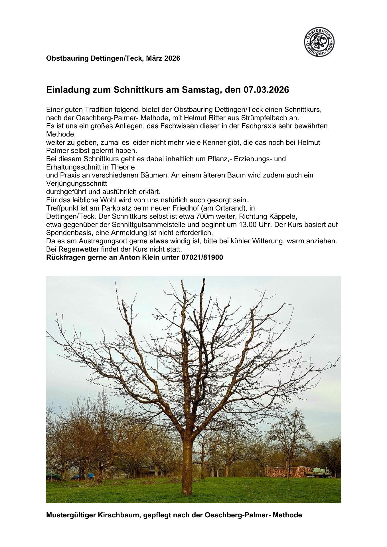 Der Obstbauring Dettingen unter Teck veranstaltet am 7.3.2026 einen Schnittkurs mit Helmut Ritter, nach der bewährten Öschberg-Palmer Methode.